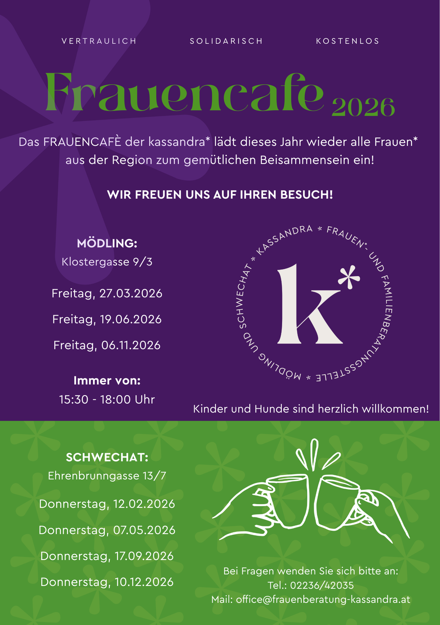 Eingeladen sind alle Frauen* aus der Region Mödling und Bruck an der Leitha/Schwechat. Es soll ein Ort sein, an welchem Frauen* zusammenkommen und sich austauschen können. In angenehmer und gemütlicher Atmosphäre.